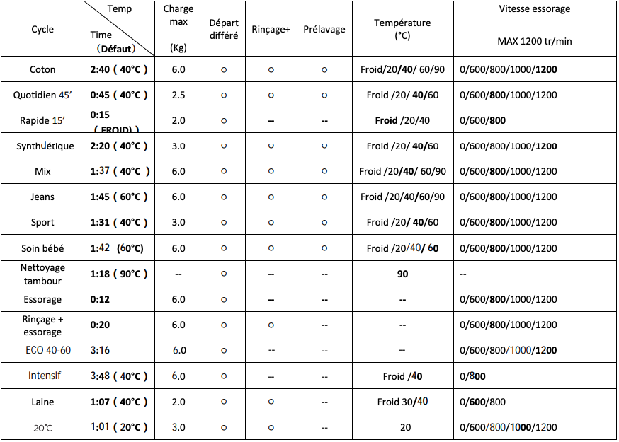 En fonction de la pression et de la dureté de l’eau, de la température d’arrivée de l’eau, de la quantité et de la nature des textiles, des détergents utilisés, de la détection de mousse, de la détection de balourd, du degré de saleté, des conditions ambiantes, des fonctions supplémentaires sélectionnées, les valeurs données dans le manuel ou avec la machine peuvent différer des valeurs standard déclarées, lesquelles sont basées sur des essais réalisés dans des conditions de laboratoire.