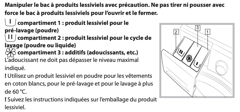 Lisez le chapitre BAC À PRODUITS LESSIVIELS dans le mode d'emploi de la notice