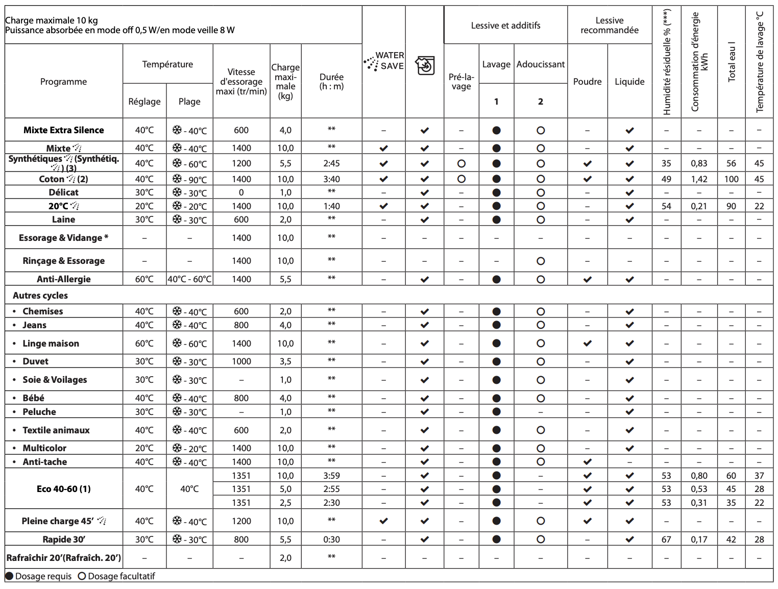 Notice Whirlpool W8W046WBFR : Section TABLEAU DES PROGRAMMES