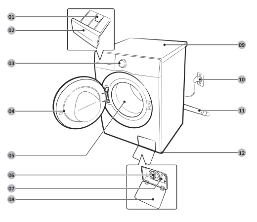 • Tuyau d'arrivée d'eau froide/chaude : pour permettre l'arrivée d'eau dans le lave-linge. (Le tuyau d'arrivée d'eau chaude n'est destiné qu'aux modèles applicables.)
