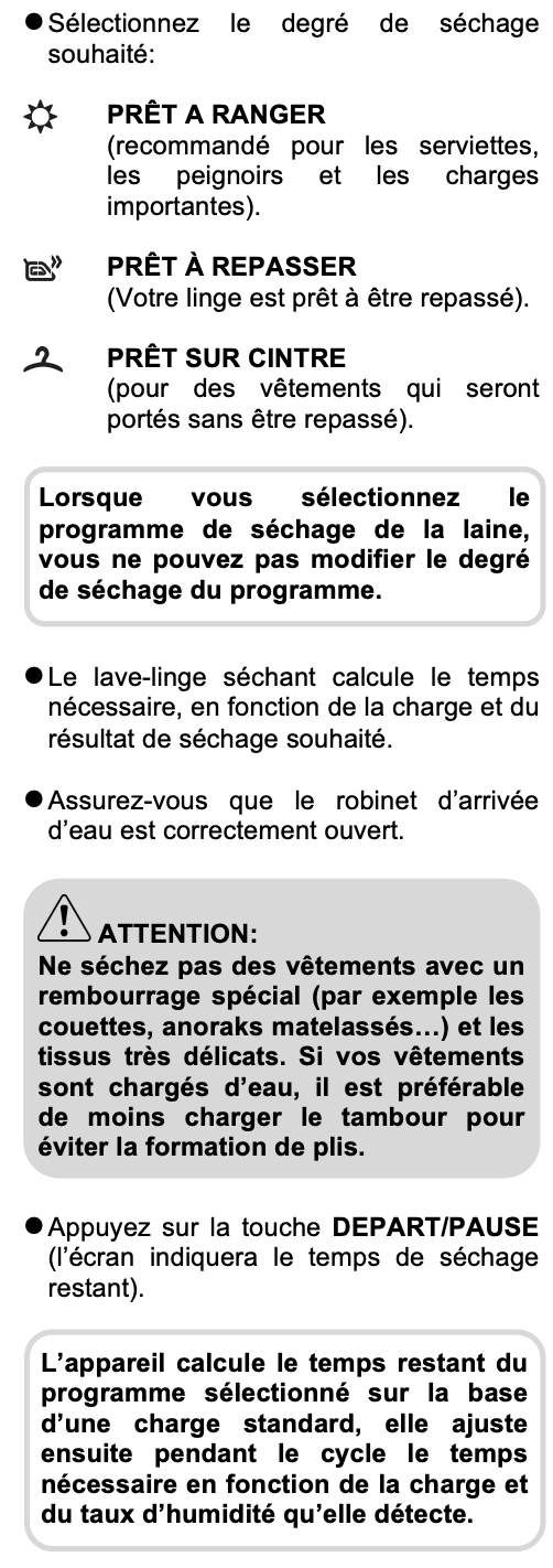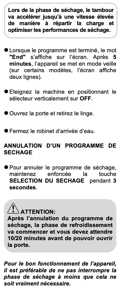 Lisez le chapitre CYCLE DE SECHAGE dans le mode d'emploi de la notice