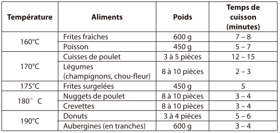 • Le guide de cuisson fourni dans le tableau ci-après est approximatif et n‘est donné qu'à titre de référence.
