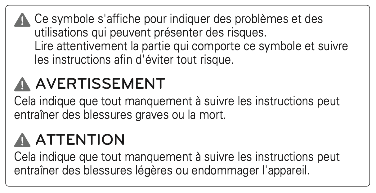 Les consignes sont séparées en 'AVERTISSEMENT' et 'ATTENTION' comme décrit ci-dessous.