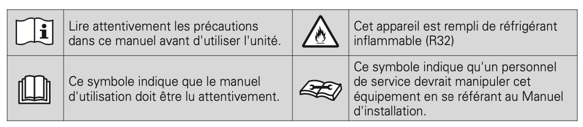 - "L’appareil devra être entreposé dans une pièce sans flammes ouvertes enpermanence (tel qu’un appareil de gaz en fonctionnement) et sources dechaleur (tel qu’un radiateur électrique en fonctionnement).(pour R32)"