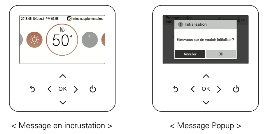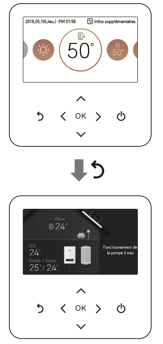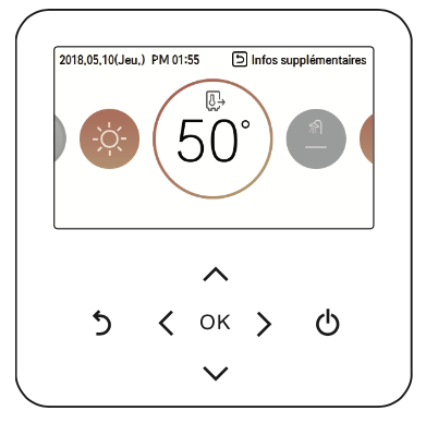 Dans les écrans à l'exception de l'écran principal, s'il n'y a pas d'activité de la télécommande pendant 1 minute, ils passent à l'écran principal.
