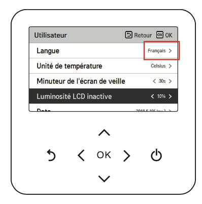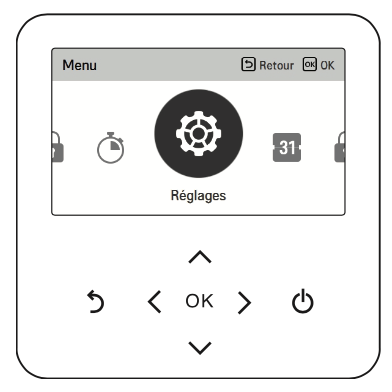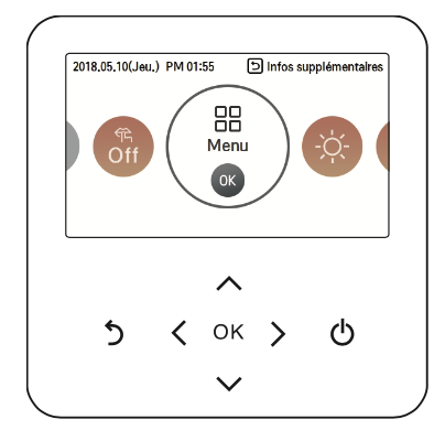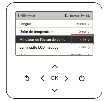 Dans l'écran principal, appuyer sur le bouton [<,> (gauche / droite)] pour sélectionner le menu et appuyer sur le bouton [OK] pour passer à l'écran du menu.