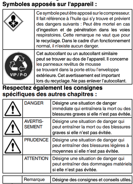 - Le réfrigérant contenu R 600a est écologique, mais inflammable. Toute fuite de réfrigérant peut être source d'incendie.
