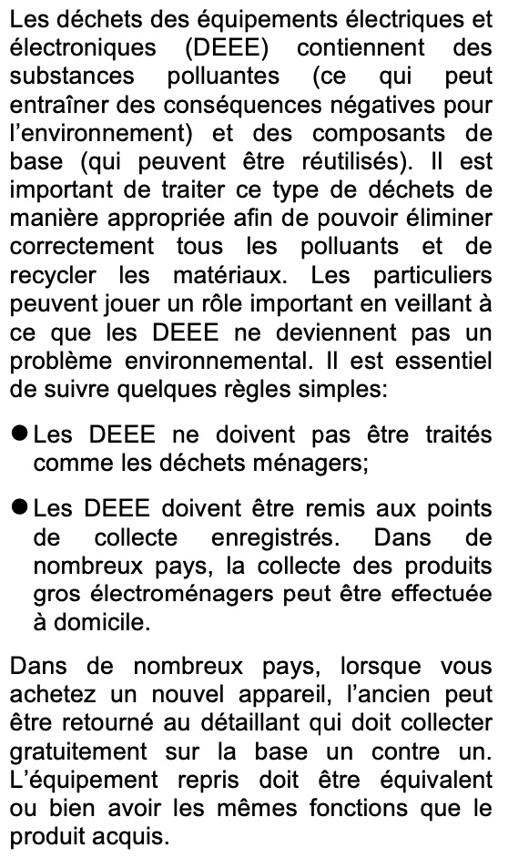 Lisez le chapitre Règles environnementales dans SAV de la notice