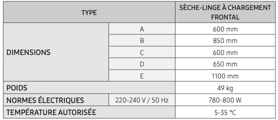 Notice Samsung DV90TA040TE Caractéristiques techniques