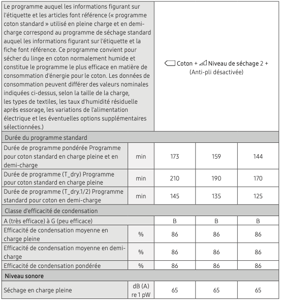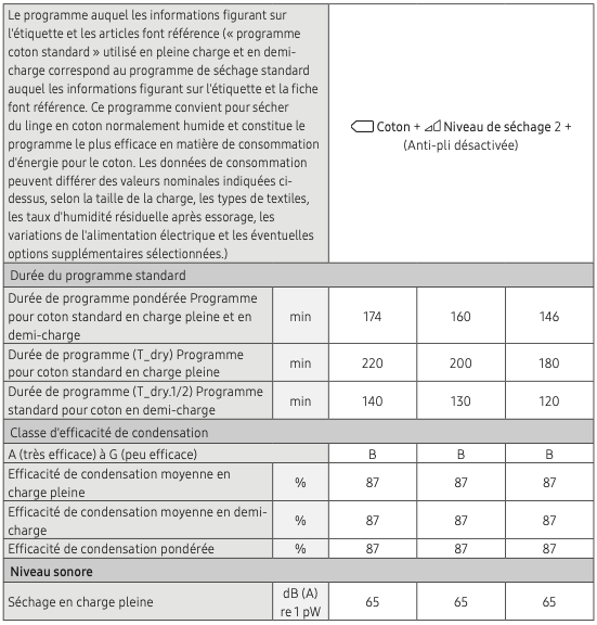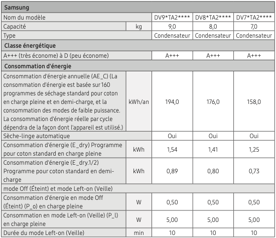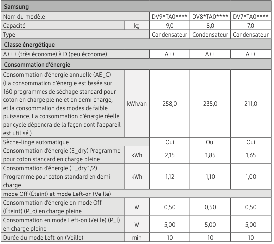 Notice Samsung DV90TA040TE Fiche de caractéristiques techniques