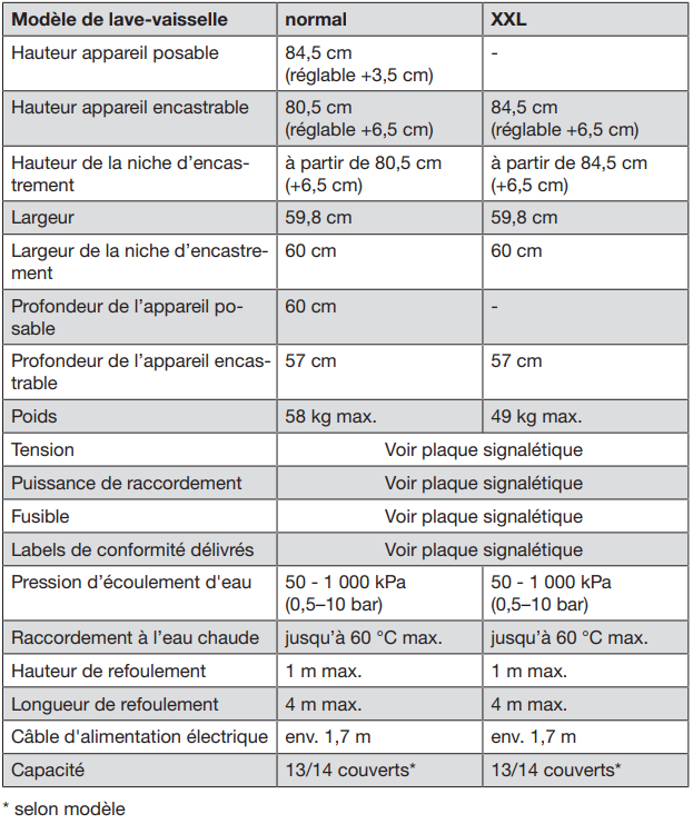 Notice Miele G 5212 SC BLANC Caractéristiques techniques
