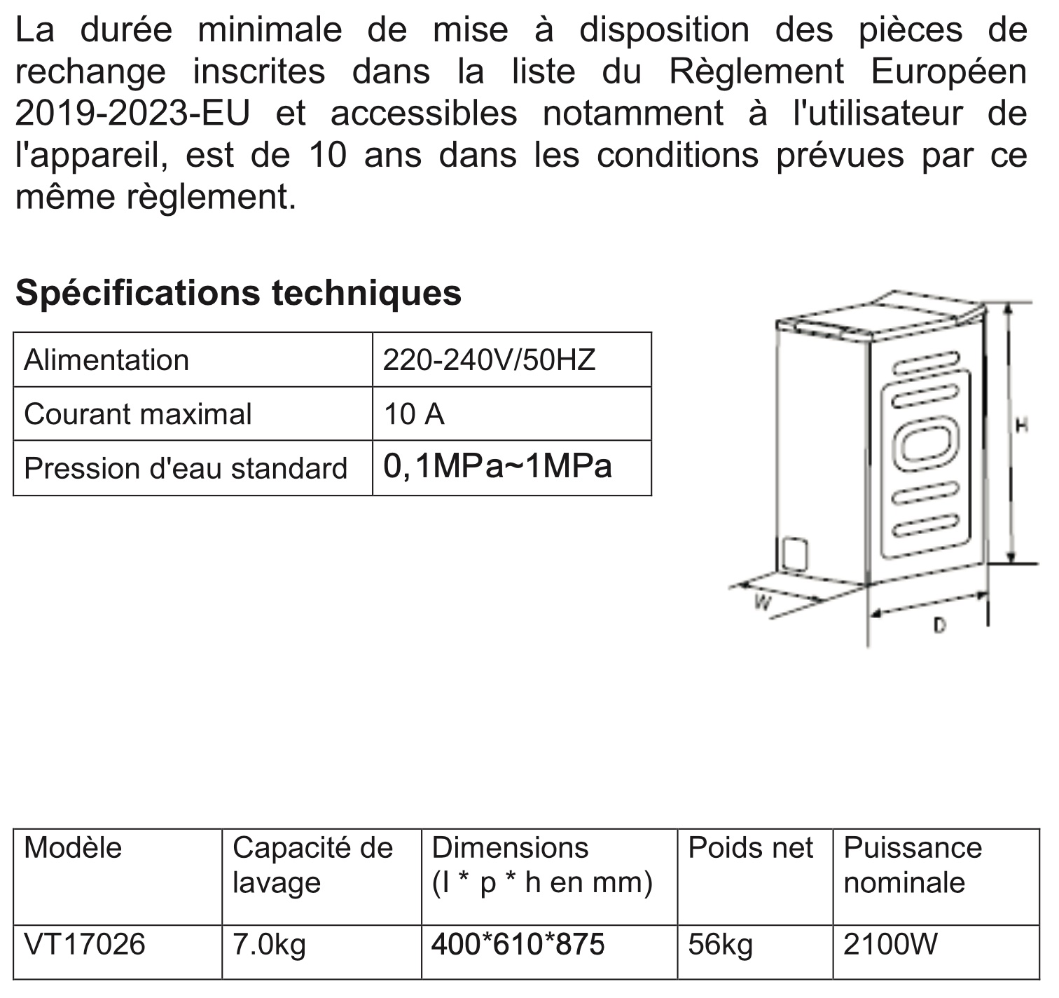 Notice Vedette VT17026 Disponibilité des pièces