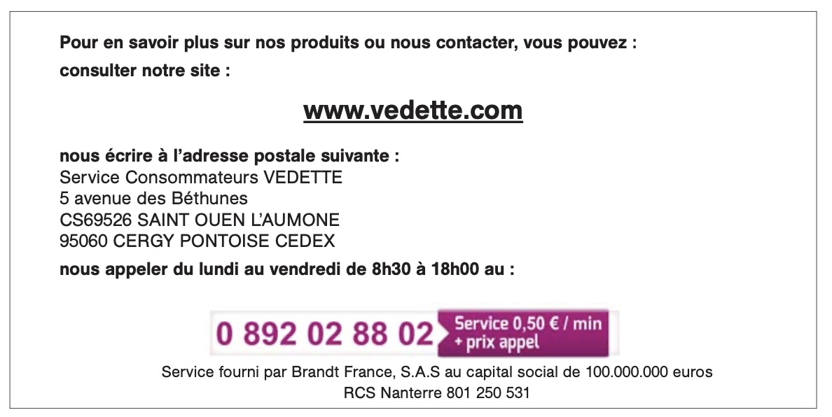 Notice Vedette VLT1255W RELATIONS CONSOMMATEURS FRANCE