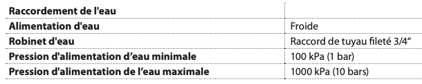 Lisez le chapitre DONNÉES TECHNIQUES POUR LE RACCORDEMENT DE L'EAU dans SAV de la notice