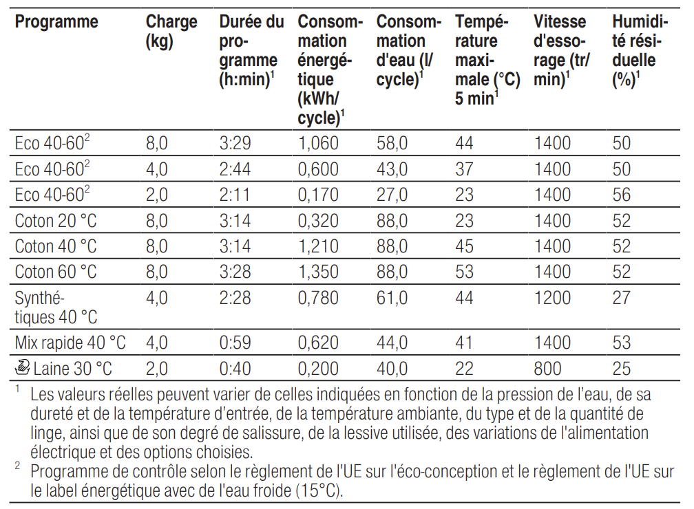 Notice Bosch WAN28228FF Valeurs de consommation