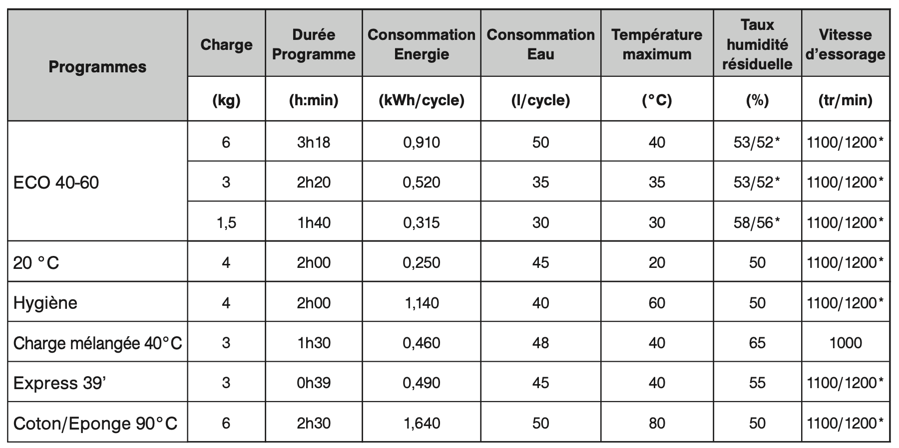 Les valeurs données pour les programmes autres que le programme ECO 40-60 sont purement indicatives. Elles peuvent varier en fonction des conditions d’utilisation de l’appareil et de son environnement.