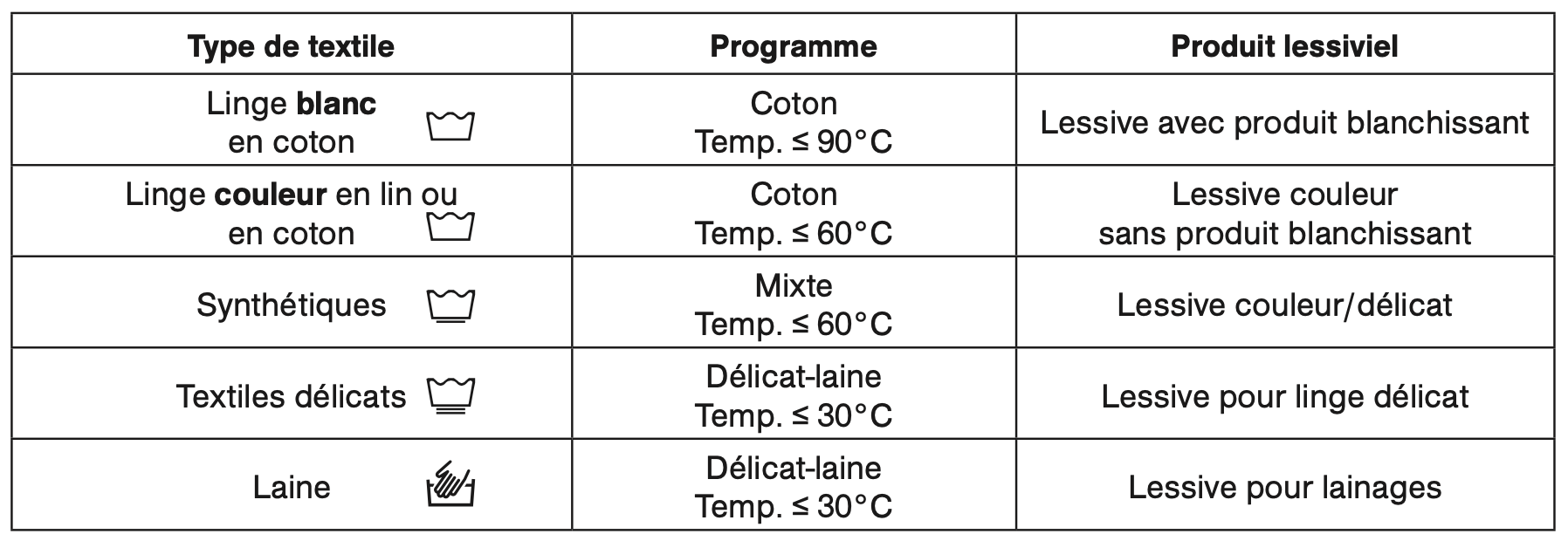 Le symbole d’entretien du linge définit le bon choix de lessive, de la bonne température et du traitement adéquat du linge.