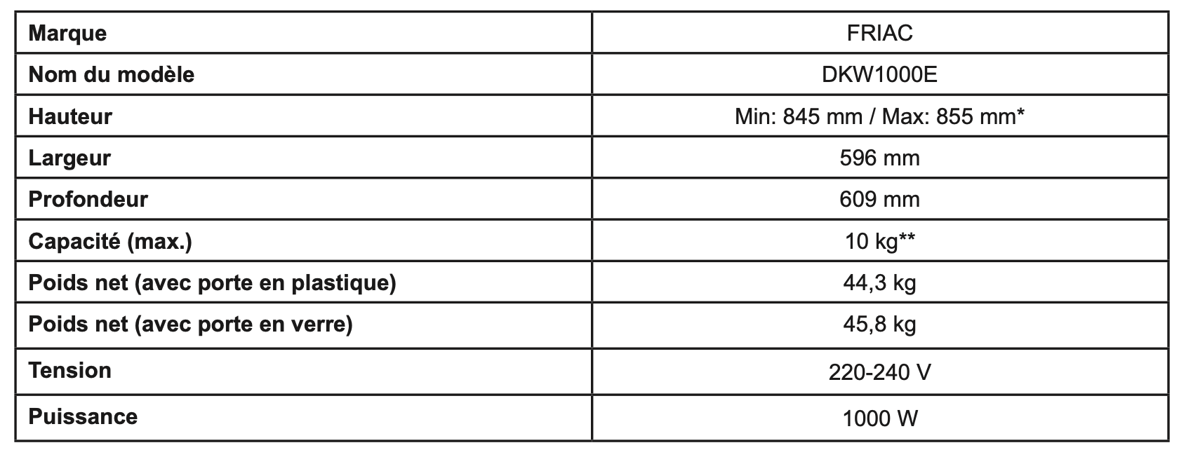 Notice Friac DKW1000E CARACTÉRISTIQUES TECHNIQUES