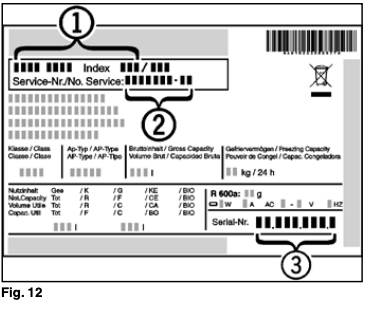 Consultez la désignation de l'appareil fig. 12 (1), le numéro de service fig. 12 (2) et le numéro de série fig. 12 (3) figurant sur la plaque signalétique. La plaque signalétique se trouve sur la face intérieure gauche de l'appareil.