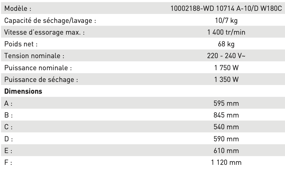 Notice Valberg WD 10714 A 10/D W180C Spécifications